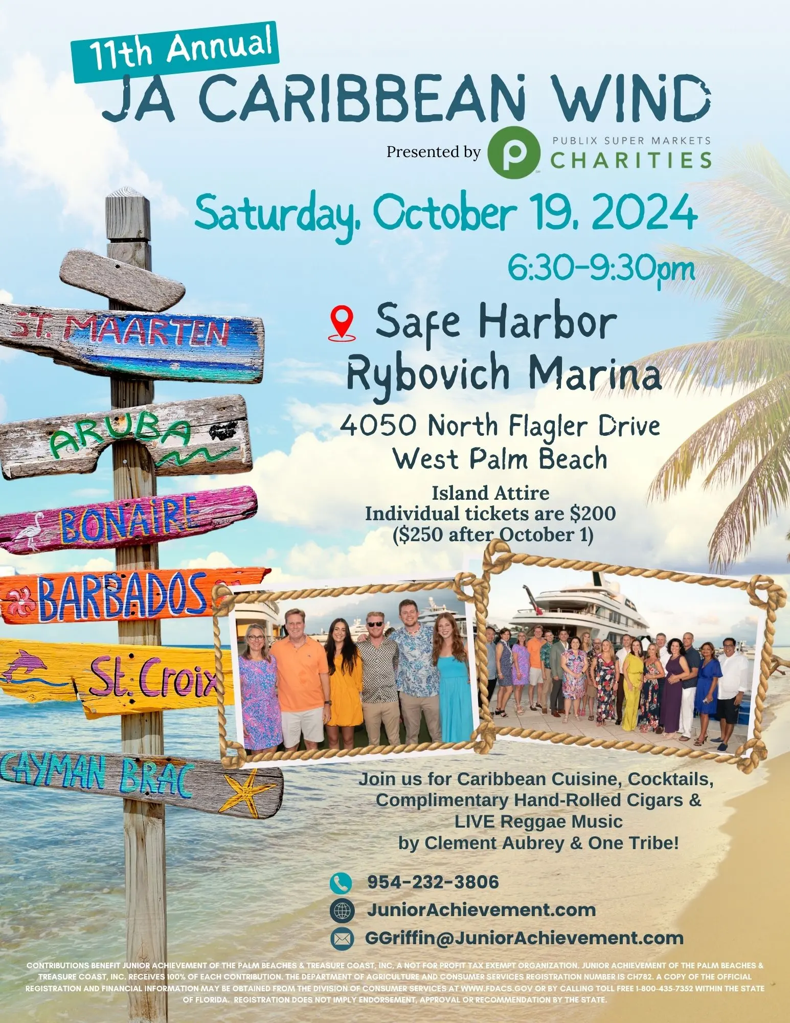 Join us at the 11th Annual JA Caribbean Wind Presented by Publix Super Markets Charities to catch the breeze at Safe Harbor Rybovich on Saturday, October 19, 2024, from 6:30 p.m. to 9:30 p.m. Dive into Caribbean cuisine, sip on tropical cocktails, enjoy hand-rolled cigars, and groove to the reggae beats of Clement Aubrey and One Tribe. Set against the majestic backdrop of yachts up to 100 meters long, this event promises an unforgettable night on deck. Let's launch the new school year in style and steer toward educational success for our future leaders! Don your finest island attire and secure your spot for $200 per ticket ($250 after October 1).